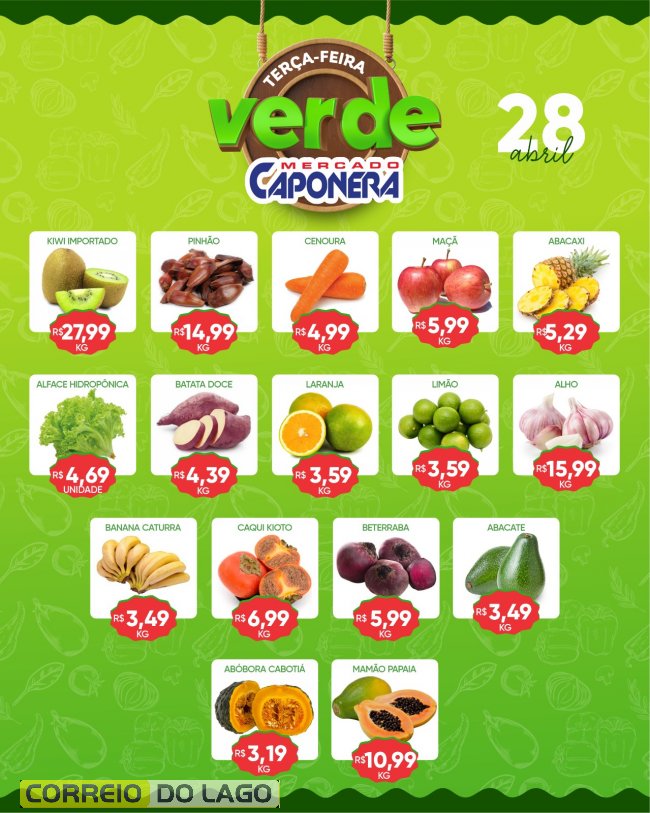 O Mercado Caponera promove nesta terça-feira (28) mais uma edição da Terça Verde, com descontos em produtos frescos e selecionados.