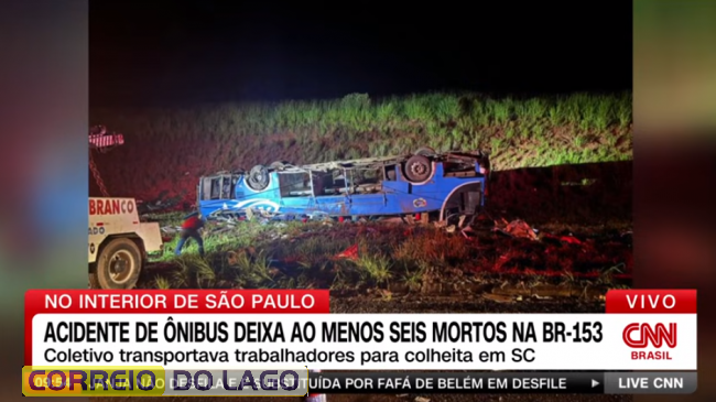 Seis pessoas morreram em um acidente envolvendo um ônibus que transportava trabalhadores rurais do Maranhão para Santa Catarina na BR-153, em Marília, no interior de São Paulo, na madrugada desta segunda-feira (16).
