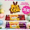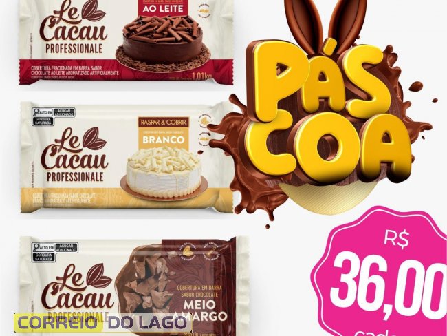 Entre os destaques, estão barras de chocolate da Cacau Show, de 1,01 kg, nos sabores ao leite, branco e meio amargo, por R$ 36 cada. Também estão disponíveis o ovo Poeme, de 500 g, por R$ 49,90, e barras de chocolate Garoto, de 500 g, por R$ 39,90. As compras podem ser parceladas em até três vezes no cartão.