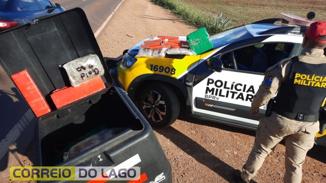 Diante da suspeita, os policiais perguntaram se havia algo ilícito no veículo. O condutor negou inicialmente, mas, ao ser solicitado que abrisse o compartimento de carga acoplado à motocicleta, confessou que transportava maconha.