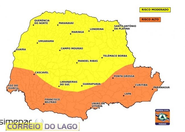 O Simepar alerta para o risco de tempestades pontualmente intensas, com chuva forte em curto espaço de tempo, rajadas de vento mais intensas, descargas elétricas e granizo. Há possibilidade de enxurradas, alagamentos, transbordamento de córregos, destelhamentos, danos em plantações, redução da visibilidade nas estradas e interrupções no fornecimento de energia.