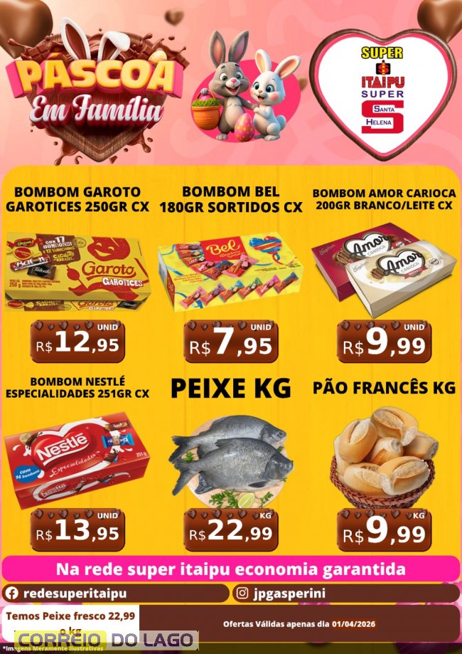A Páscoa está chegando e os supermercados Super Itaipu e Super Santa Helena prepararam ofertas especiais para garantir uma celebração completa, com muito sabor e preços que cabem no bolso. Ofertas da Páscoa em Família validas somente para esta quarta-feira (01), os clientes encontram uma seleção de produtos com descontos exclusivos.