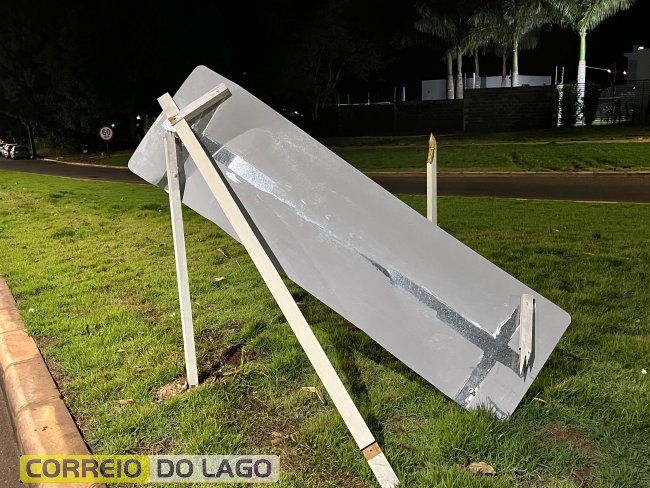 Uma placa de sinalização foi danificada na noite deste domingo (15), no trevo de acesso à cidade, localizado próximo ao posto da Polícia Rodoviária Estadual (PRE), em Santa Helena.