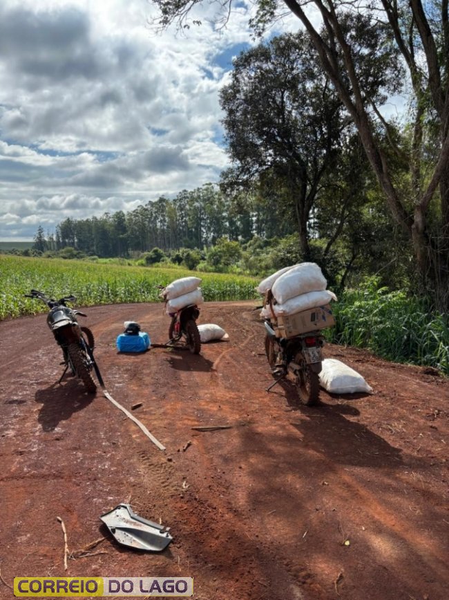 Em dado momento, a equipe avistou uma motocicleta emergindo da mata ciliar e transitando por uma estrada vicinal, transportando um volume suspeito. Ao tentar a abordagem, o condutor fugiu por uma lavoura de milho. Após breve acompanhamento, a motocicleta foi interceptada, mas o indivíduo conseguiu evadir-se a pé pelo milharal e não foi capturado. Durante a vistoria no veículo, constatou-se que o volume se tratava de agrotóxico de origem paraguaia. Em continuidade ao patrulhamento pelas imediações, a equipe localizou outras duas motocicletas, ambas carregadas com produtos de origem estrangeira. No total, foram apreendidas três motocicletas, uma caixa de cigarros paraguaios, aproximadamente 350 kg de agrotóxicos (herbicidas e inseticidas) de origem paraguaia, além de um volume contendo substâncias anabolizantes e canetas emagrecedoras.