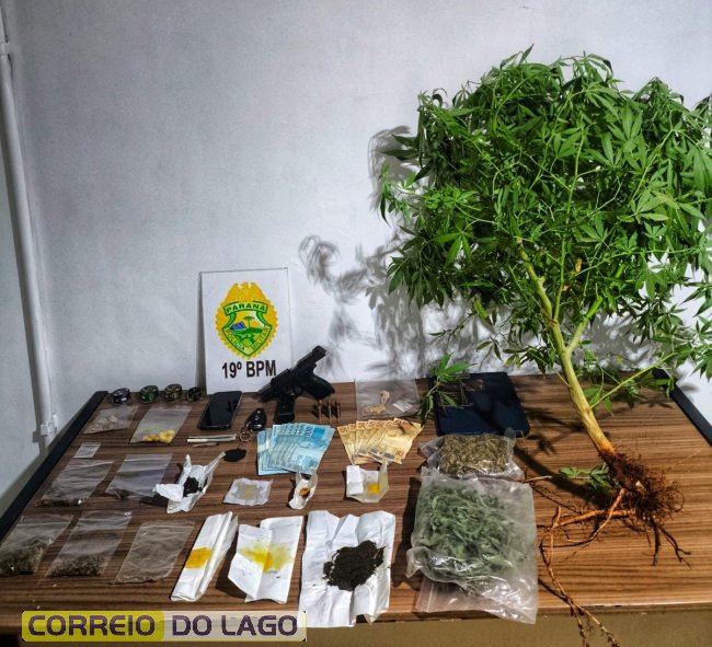 Durante as buscas, também foi apreendida uma arma de fogo calibre .40 municiada, munições, dinheiro em espécie e uma planta com características semelhantes à cannabis sativa, cultivada no quintal da residência.