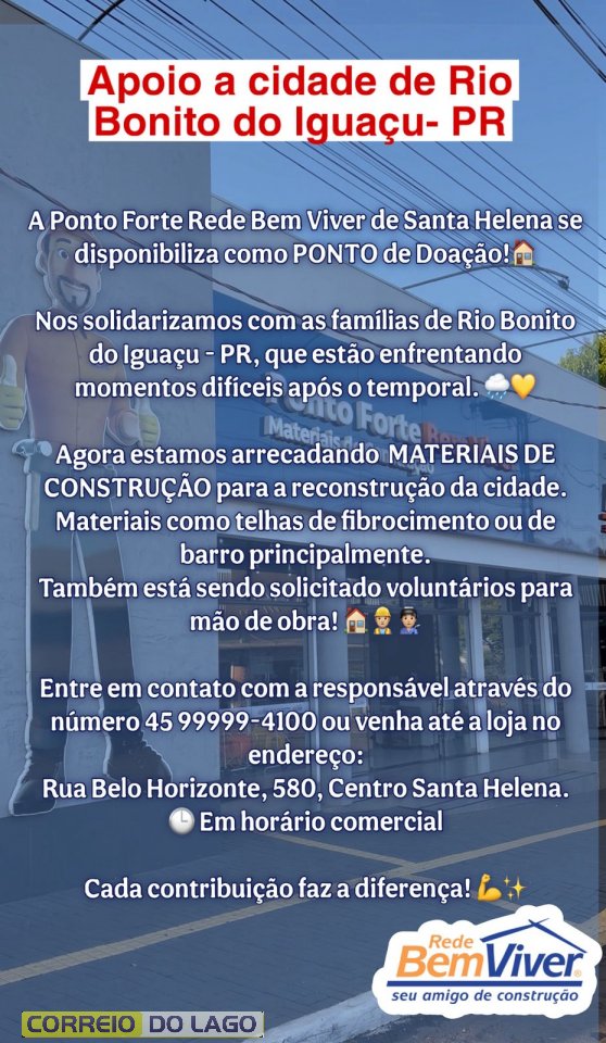 Empresas como as da Rede Bem Viver estão se mobilizando na arrecadação de materiais de construção. De Santa Helena deve partir uma carreta ainda nesta semana, carregada com materiais para reconstruir a cidade de Rio Bonito do Iguaçu.