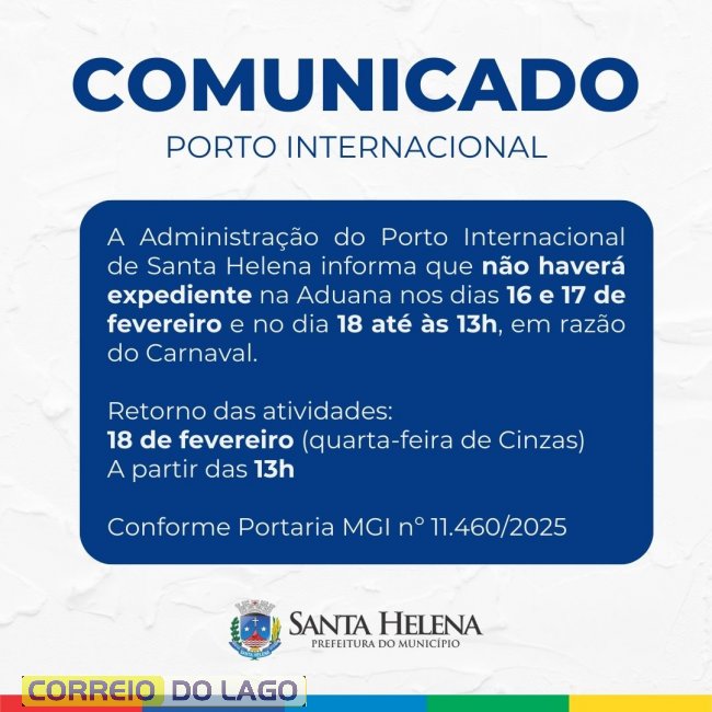 A Administração do Porto Internacional de Santa Helena informou que não haverá expediente na Aduana durante o período de Carnaval. A medida vale para os dias 16 e 17 de fevereiro, além do dia 18 de fevereiro de 2026 até às 13h.