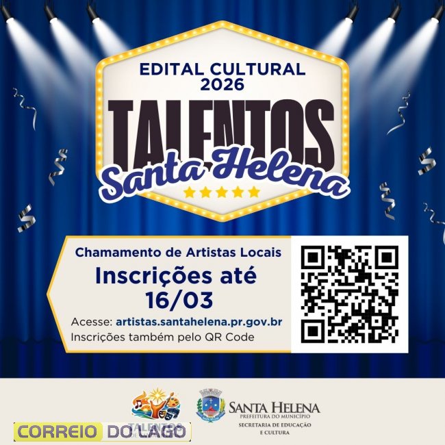 As inscrições estão abertas desde a publicação do edital e seguem até 16 de março de 2026, às 17h30. O cadastro deve ser feito exclusivamente pelo endereço eletrônico artistas.santahelena.pr.gov.br. Para retirada de duvidas telefone WhatsApp (45) 3268-8349