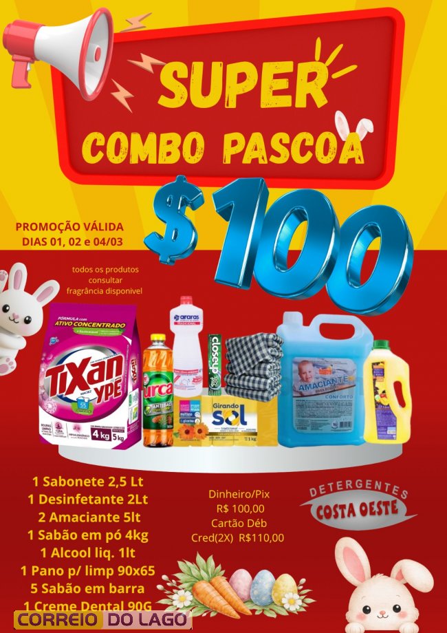 A Detergentes Costa Oeste, em Santa Helena, apresenta uma promoção de Páscoa com combo de produtos de limpeza por R$ 100 no Pix ou dinheiro, que reúne itens essenciais e facilita o pagamento