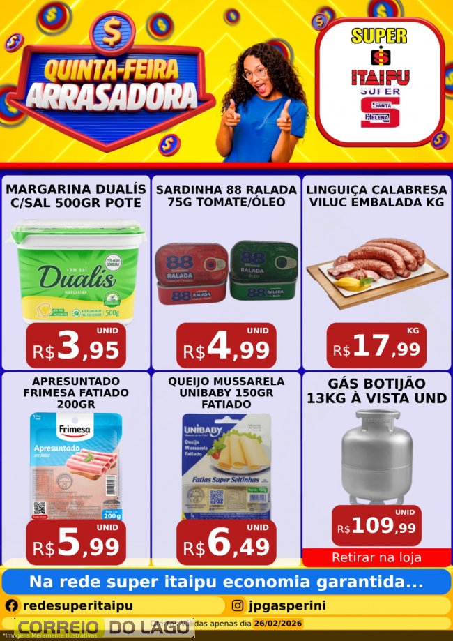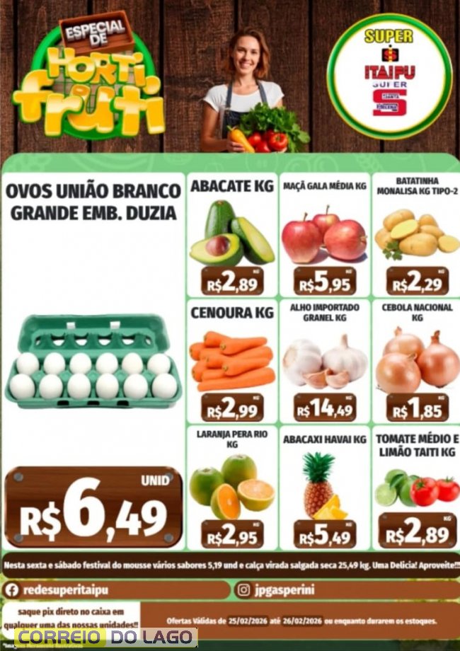 Nesta quinta-feira (26), as lojas reúnem preços especiais em produtos de hortifruti, alimentos de mercearia, frios e itens essenciais do dia a dia. As condições são válidas por tempo limitado, enquanto durarem os estoques, no Super Itaipu e Super Santa Helena.
