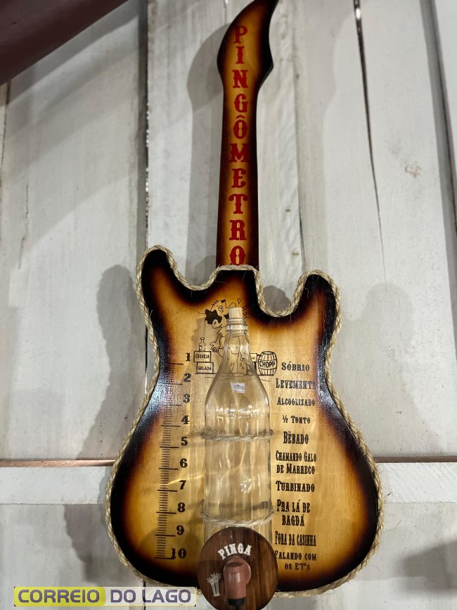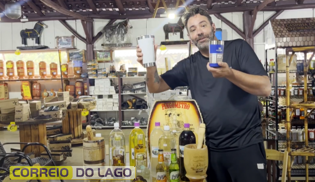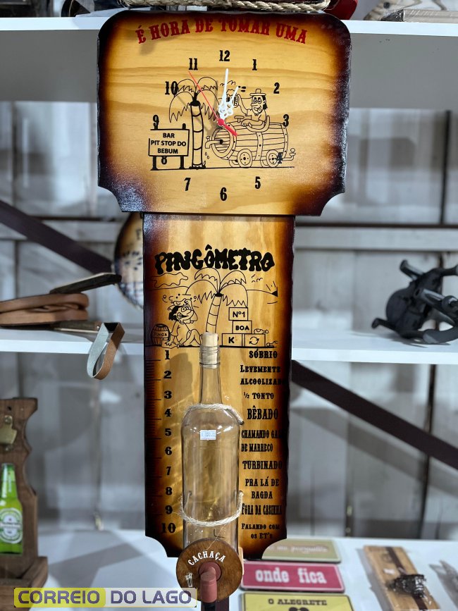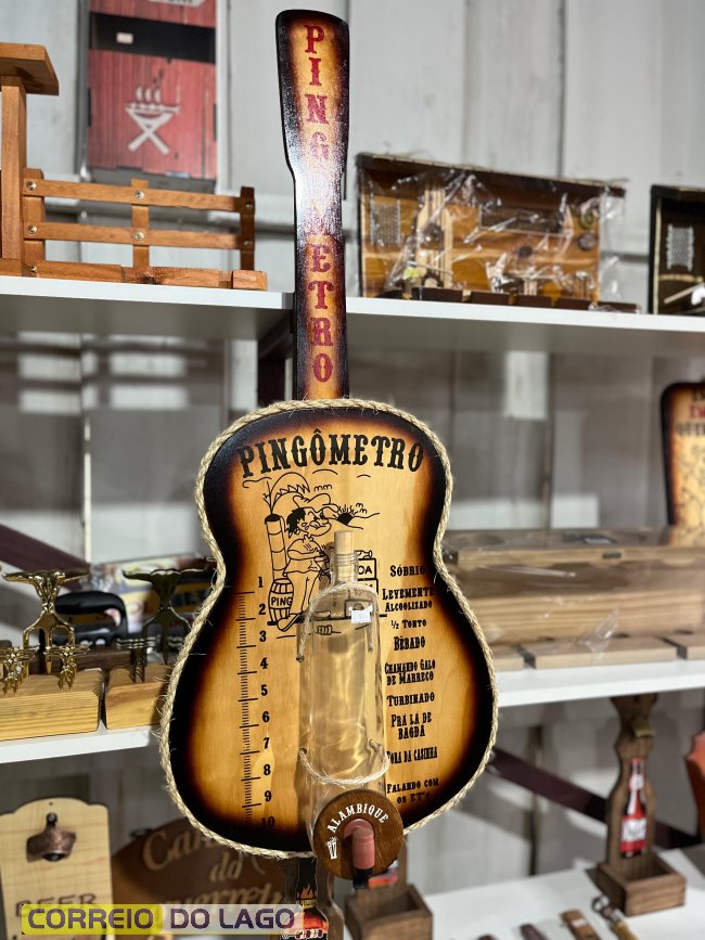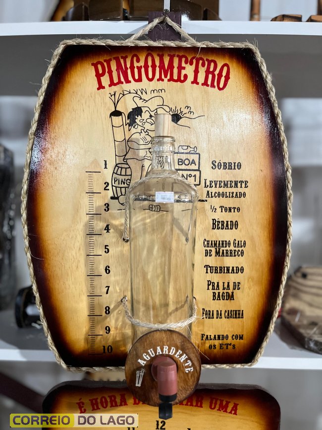 Durante a reportagem, Sabugo apresentou ainda o “pingômetro”, acessório usado para controlar a quantidade de doses servidas. Além das bebidas, o Rancho Crioulo dispõe de outros itens, incluindo cadeiras, artigos em couro e facas.