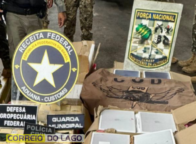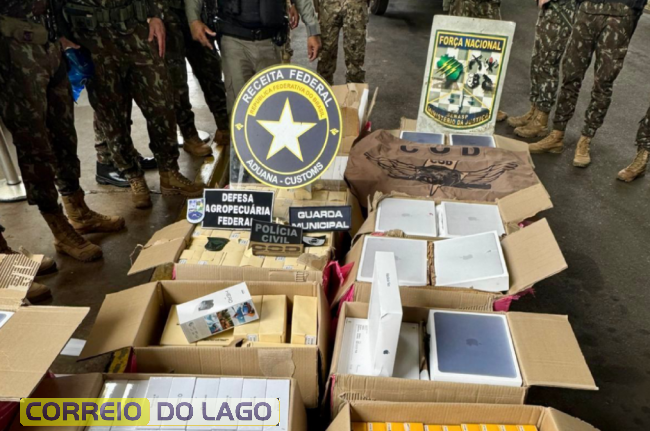 Na vistoria, os agentes identificaram um fundo falso no caminhão. No compartimento oculto estavam diversas caixas com produtos introduzidos irregularmente no Brasil, incluindo notebooks e celulares.