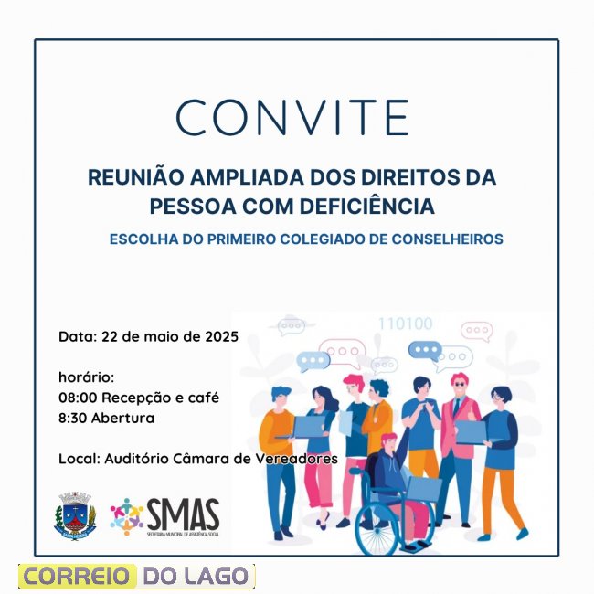 Na quinta-feira, dia 22 de maio de 2025, será realizada a primeira reunião ampliada voltada à formação do Conselho Municipal da Pessoa com Deficiência em Santa Helena. O evento acontece na Câmara Municipal de Vereadores, com recepção e café a partir das 8h, e abertura oficial às 8h30.