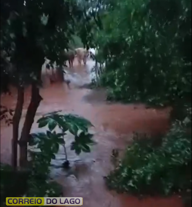 Fotos e vídeos enviados ao Correio do Lago mostram ruas alagadas e casas parcialmente tomadas pela água, evidenciando a gravidade do cenário.