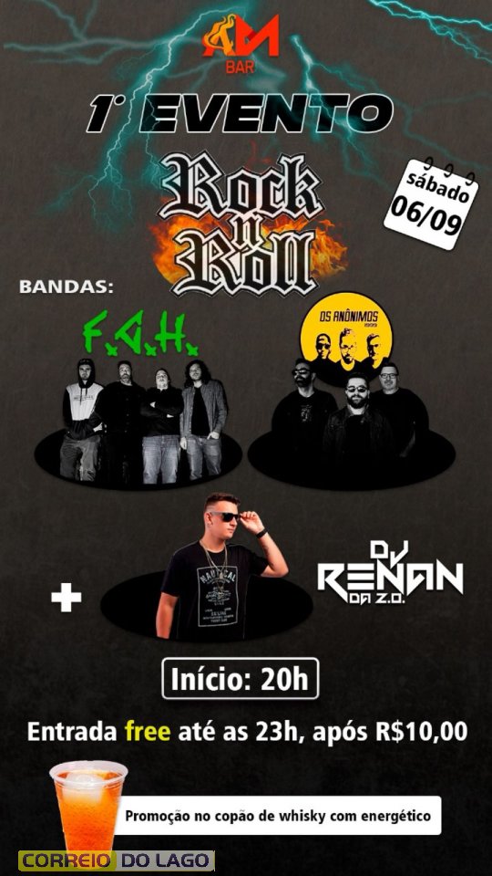 Os fãs de rock da região têm um encontro marcado neste sábado (06), no AM Bar, em Pato Bragado, com início às 20h. O evento contará com as bandas santahelenenses Os Anônimos e F.G.H., além da animação do DJ Renan da Z.O.. A entrada é franca até as 23h; após esse horário, o valor será de R$ 10,00. Para completar a festa, haverá promoção de copo de uísque com energético.
