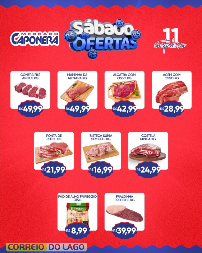 Neste sábado (11), o Mercado e Açougue Caponera oferece descontos em carnes, frios e produtos de mercearia, garantindo economia e qualidade aos clientes.