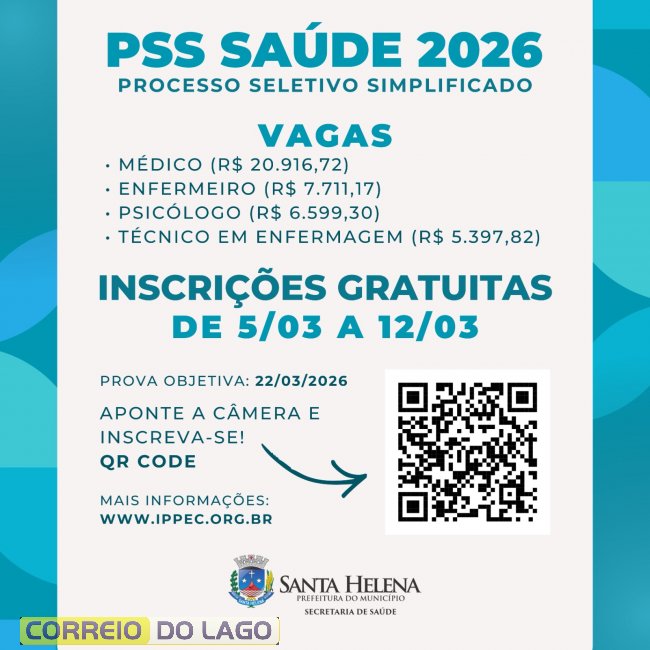 A Prefeitura de Santa Helena publicou nesta terça-feira (3) o edital do Processo Seletivo Simplificado (PSS) nº 001/2026, com vagas temporárias e formação de cadastro reserva para profissionais de níveis técnico e superior na área da saúde, em Santa Helena.