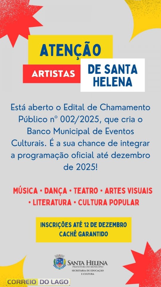 A Prefeitura de Santa Helena, por meio da Secretaria Municipal de Educação e Cultura (SMEC), publicou o Edital de Chamamento Público nº 02/2025, que convida artistas locais a se inscreverem para compor o Banco de Dados Municipal de Eventos Culturais. O objetivo é organizar e ampliar a participação de talentos do município em programações culturais realizadas até dezembro de 2025.