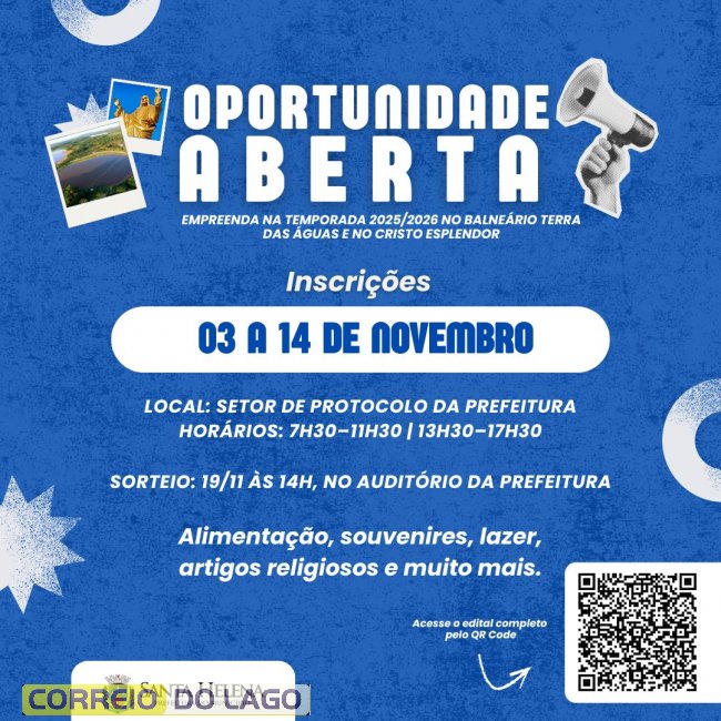 A Secretaria Municipal de Desenvolvimento Econômico publicou o Edital de Chamamento Público nº 5/2025, que visa selecionar empresas interessadas em explorar atividades comerciais no Balneário de Santa Helena e no Monumento do Cristo Esplendor durante a temporada 2025/2026.