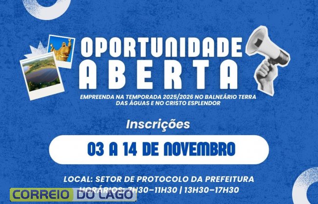 O edital estabelece critérios para autorização de uso oneroso dos espaços públicos, conforme a Lei Municipal nº 3.019/2022, abrangendo ramos como alimentação, bebidas, souvenires, artigos religiosos, esportes, lazer e recreação aquática. As inscrições devem ser realizadas entre os dias 3 e 14 de novembro de 2025, diretamente no Setor de Protocolo da Prefeitura (Rua Paraguai, 1401 – Centro), das 7h30 às 11h30 e das 13h30 às 17h30.