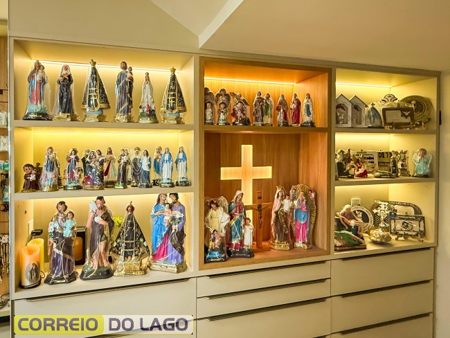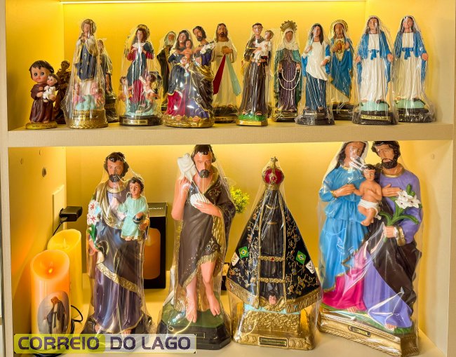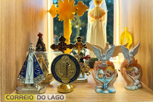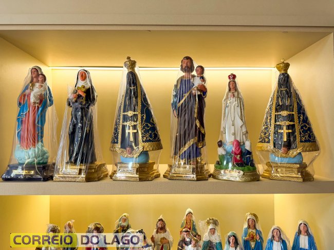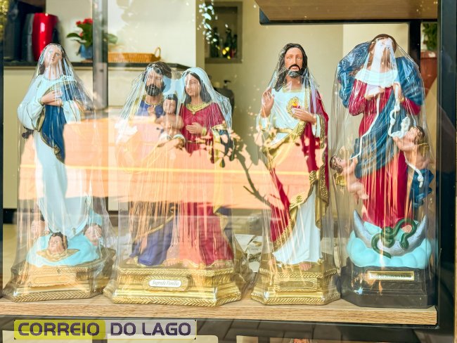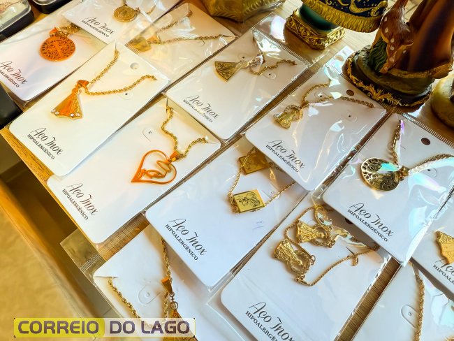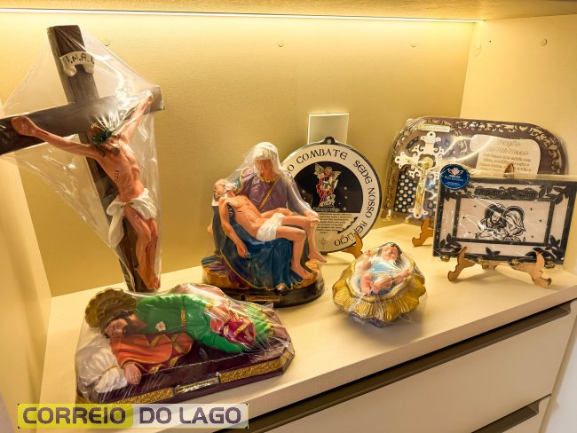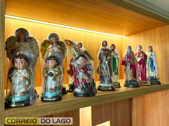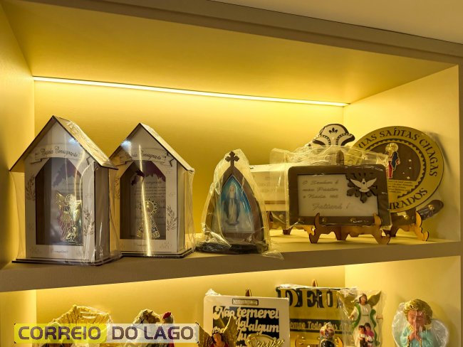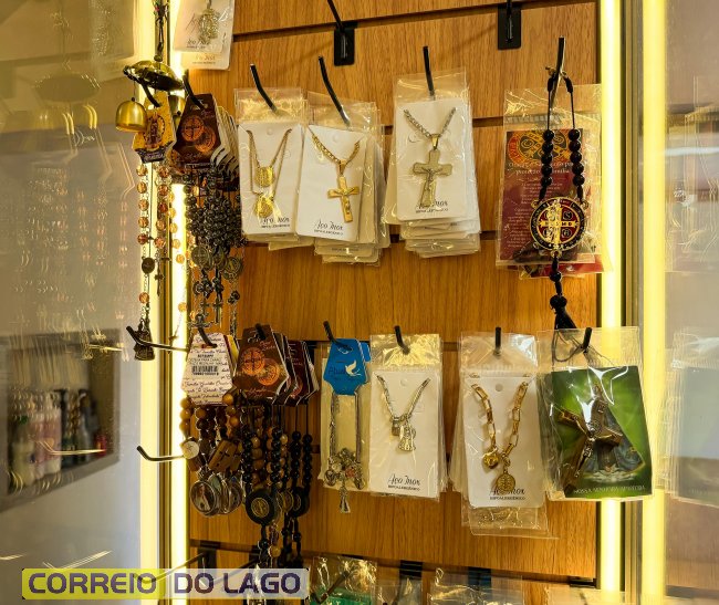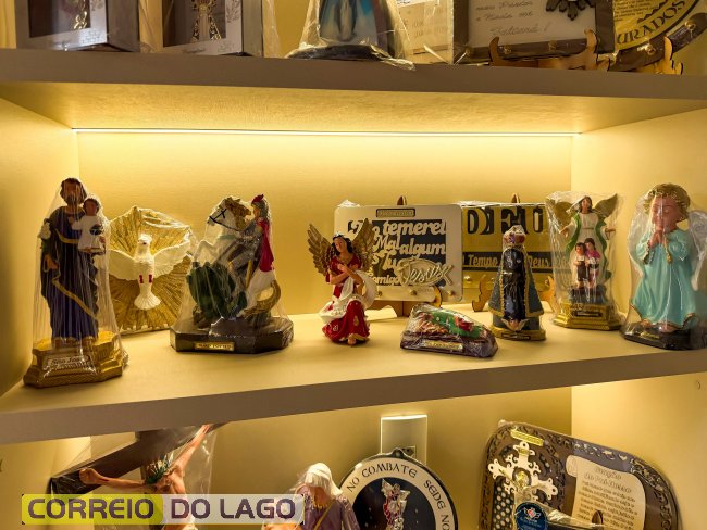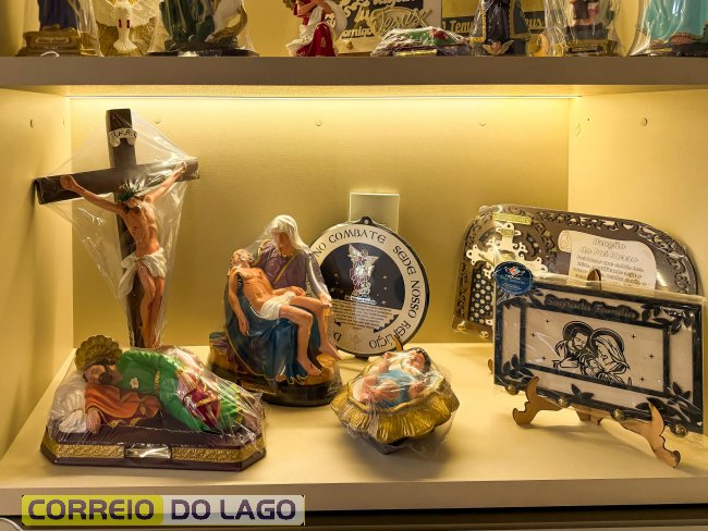 O estabelecimento, que funciona anexo ao salão de beleza, disponibiliza desde imagens de santos até chaveiros, terços e diversos outros itens.