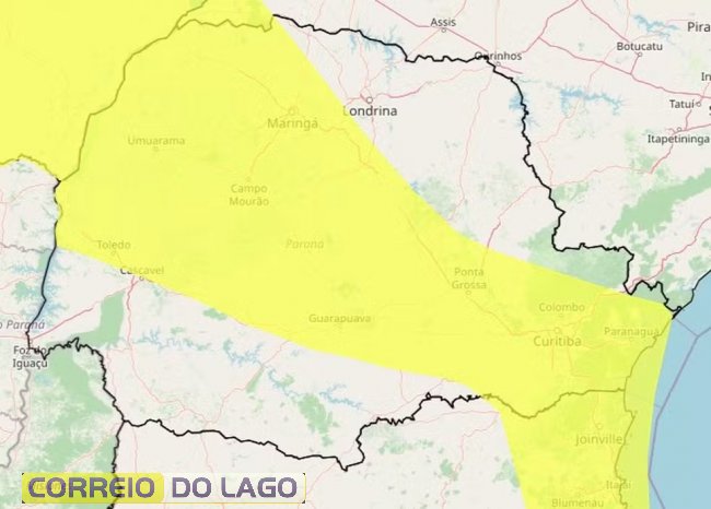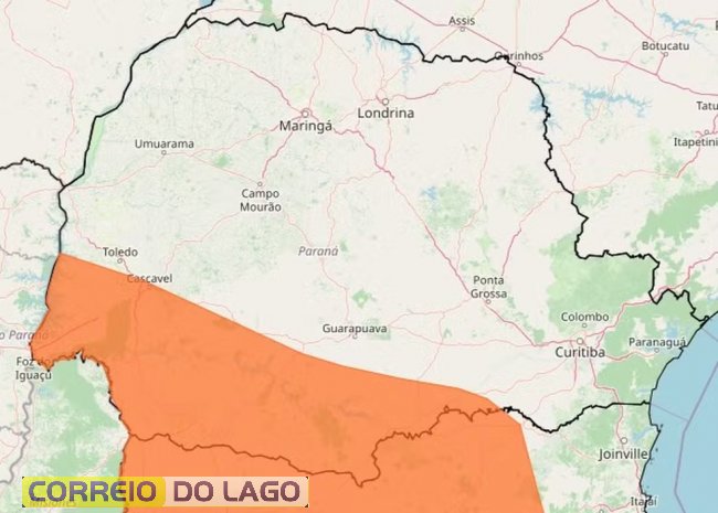 O alerta mais severo é voltado ao sul, sudeste e oeste do Paraná. O aviso é válido das 10h deste domingo (30) às 10h de segunda-feira (30), e indica que: