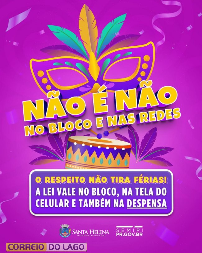 A Prefeitura de Santa Helena aderiu oficialmente à campanha estadual “Não é Não, no Bloco e nas Redes”, promovida pelo Governo do Estado do Paraná, por meio da Secretaria de Estado da Mulher, Igualdade Racial e Pessoa Idosa (SEMIPI). A iniciativa tem como foco prevenir casos de assédio e reforçar a proteção às mulheres durante o Carnaval 2026.