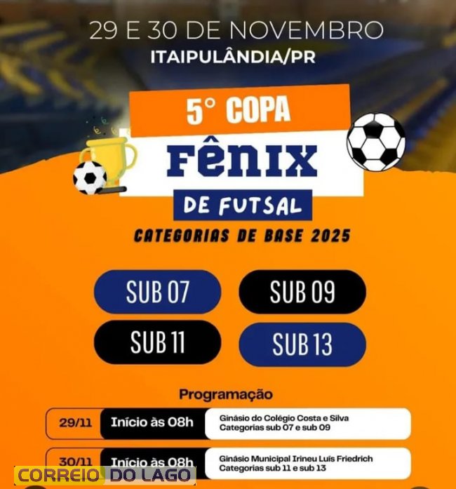 De 29 a 30 de novembro, Itaipulândia será palco da 5ª Edição da Copa Fênix de Futsal, reunindo jovens talentos nas categorias Sub-09, Sub-11 e Sub-13 masculino. Pela primeira vez, as seleções de Santa Helena participam da competição, que tradicionalmente mobiliza equipes de diversos municípios da região.