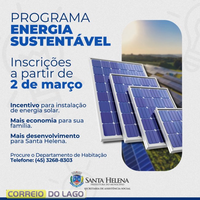 A Prefeitura de Santa Helena lançou nesta quinta-feira (26) novo edital do Programa Energia Sustentável, iniciativa que incentiva a instalação de sistemas de energia solar em residências do Município. As inscrições estarão abertas a partir do dia 2 de março.