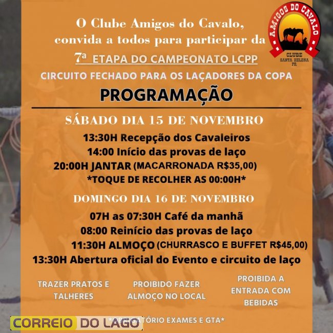 O Clube Amigos do Cavalo, de Santa Helena, realiza nos dias 15 e 16 de novembro a 7ª Etapa do Campeonato LCPP (Laço Comprido Piquete do Paraná). O evento promete reunir mais de 100 laçadores vindos de seis municípios e sete clubes participantes, consolidando-se como uma das maiores etapas do circuito.