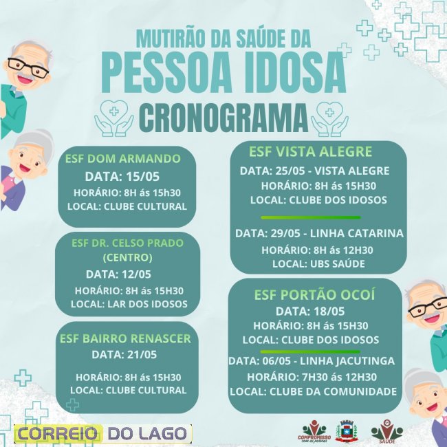 A população da Melhor Idade terá a oportunidade de colocar em dia a caderneta de saúde da pessoa idosa e ainda ser atendida por equipe multiprofissional. O mutirão é uma das estratégias utilizadas no Paraná para identificar os riscos de saúde das pessoas idosas, capacitar as equipes de saúde e educar o público-alvo da região sobre cuidados necessários à saúde e sobre seus direitos.