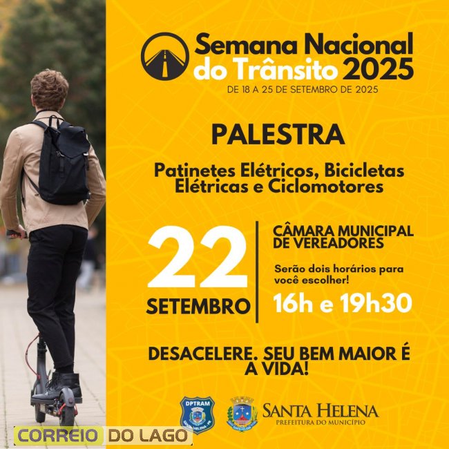 A Prefeitura de Santa Helena, por meio do Departamento Executivo de Trânsito, Rodoviário e Mobilidade (DPTRAM), promove no dia 22 de setembro, segunda-feira, uma palestra sobre Patinetes Elétricos, Bicicletas Elétricas e Ciclomotores.