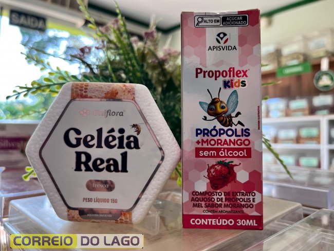 A loja conta com uma linha voltada ao reforço imunológico das crianças, com opções que se encaixam na rotina. Entre elas estão produtos à base de própolis e também a geleia real, que pode ser utilizada a partir dos seis meses, sempre com a devida orientação.