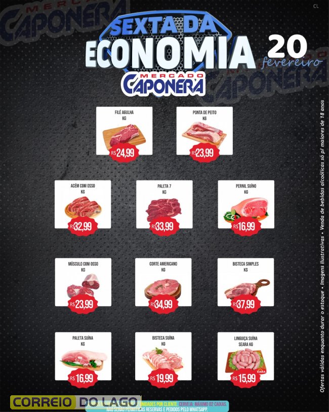Nesta sexta-feira (19), o Mercado e Açougue Caponera realiza mais uma edição do Super Dia C, com preços reduzidos em diversos produtos para quem quer economizar nas compras do Carnaval. Ofertas em itens do dia a dia e no açougue, garantindo mais praticidade e economia para abastecer a casa antes da folia. Promoções válidas apenas nesta sexta ou enquanto durarem os estoques.