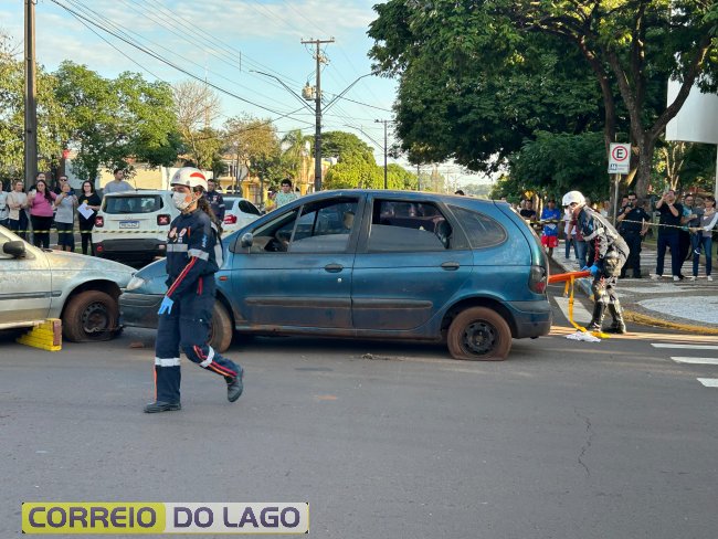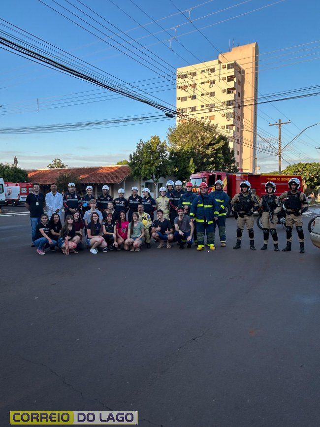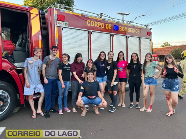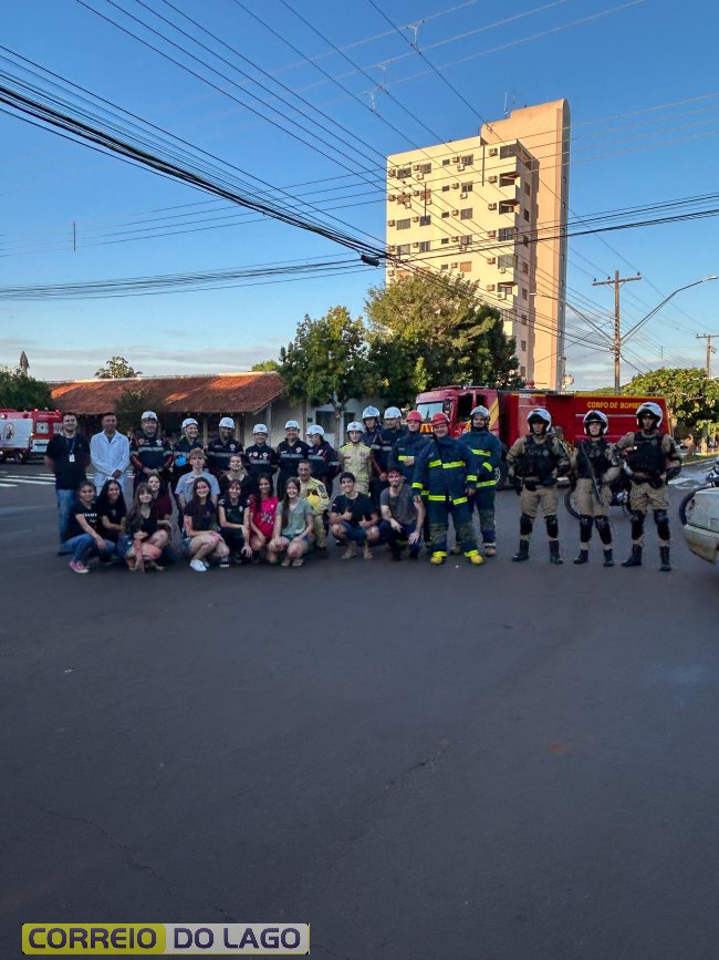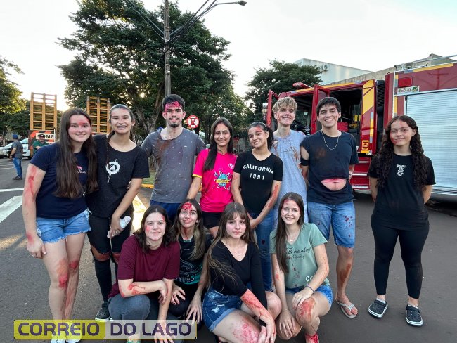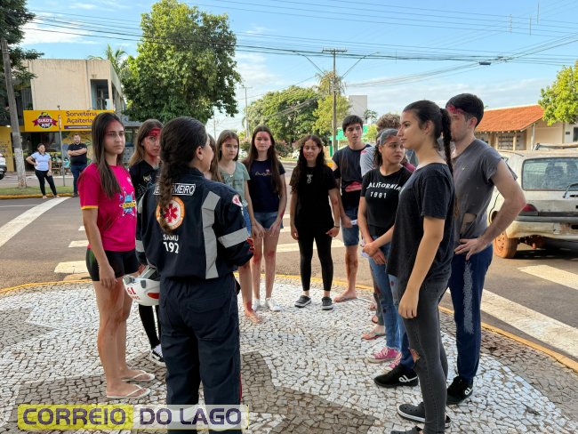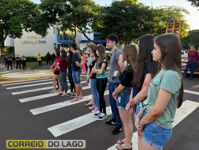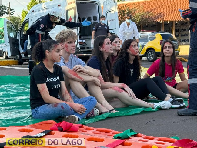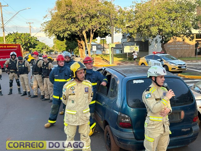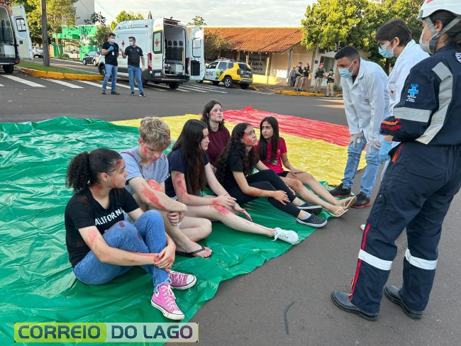 A ação aconteceu em frente à Câmara de Vereadores, no cruzamento das avenidas Paraná e Deputado Arnaldo Busato, onde três veículos foram posicionados para representar um acidente de trânsito. Alunos do Colégio Cívico-Militar Graciliano Ramos participaram da encenação como vítimas.
