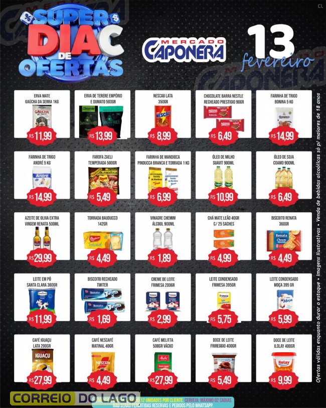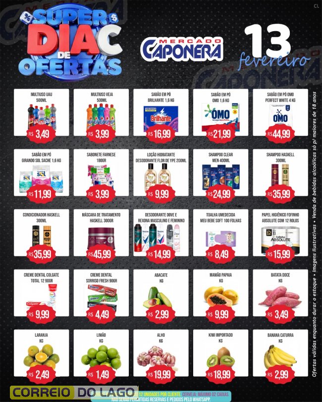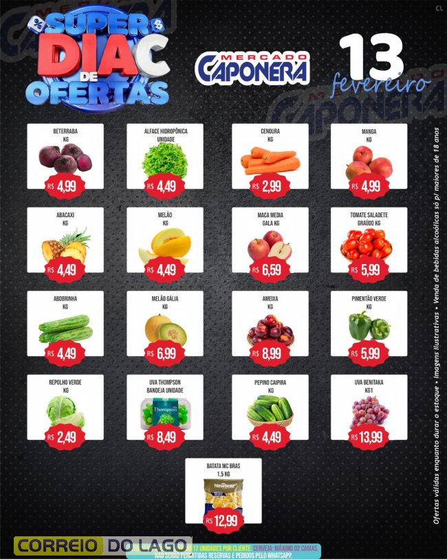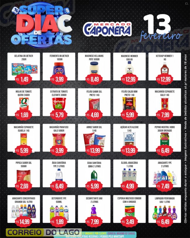 Nesta sexta-feira (13), o Mercado e Açougue Caponera realiza mais uma edição do Super Dia C, com preços reduzidos em diversos produtos para quem quer economizar nas compras do Carnaval.Ofertas em itens do dia a dia e no açougue, garantindo mais praticidade e economia para abastecer a casa antes da folia. Promoções válidas apenas nesta sexta ou enquanto durarem os estoques.
