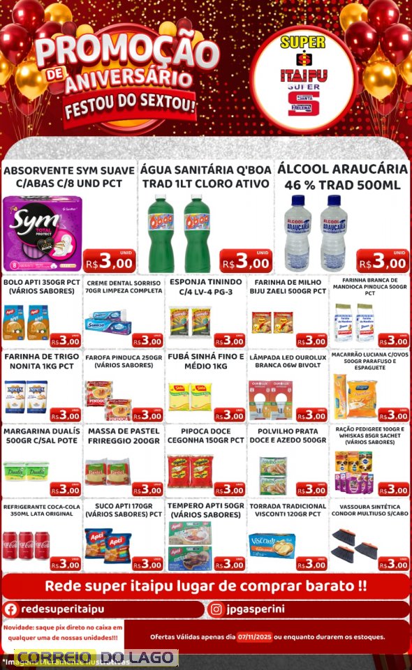 Para comemorar o mês de aniversário, Super Itaipu e Super Santa Helena lançam a promoção “Festou do Sextou”. Nesta sexta-feira (7), clientes poderão aproveitar produtos selecionados por apenas R$ 1, R$ 2 ou R$ 3, em uma oferta válida enquanto durarem os estoques. É a oportunidade perfeita para garantir economia e aproveitar os melhores preços da rede.