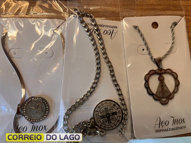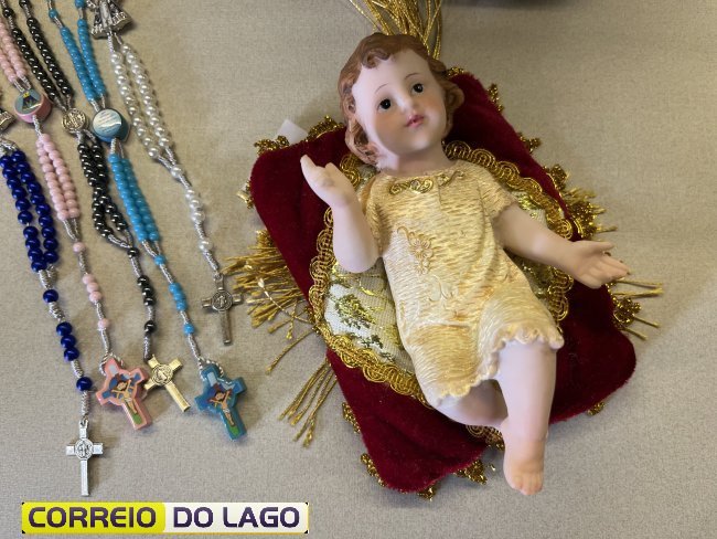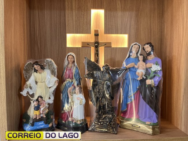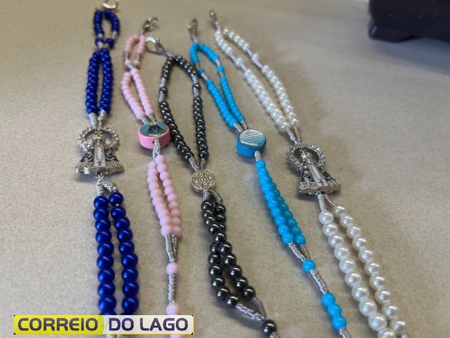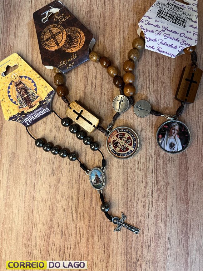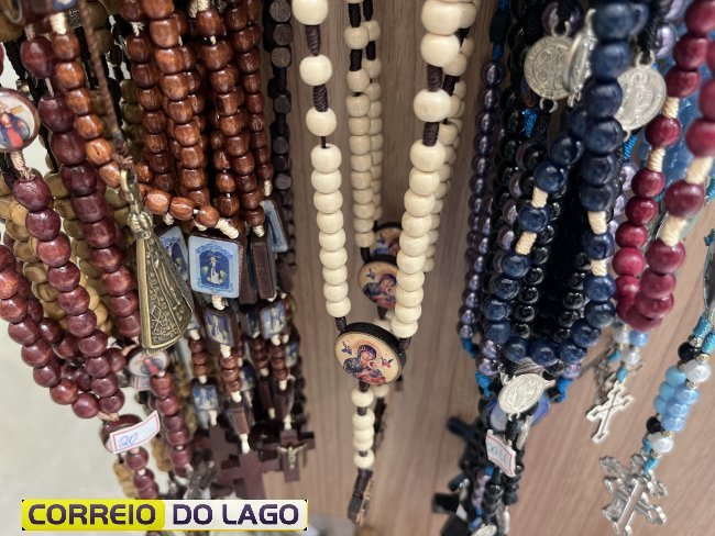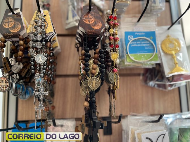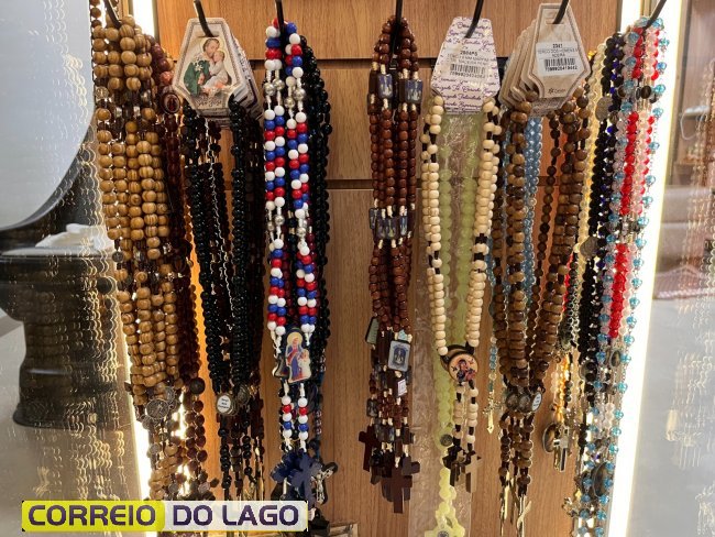 Na loja é possível encontrar imagens de santos, anjos e diferentes modelos de terços, que também podem ser usados de várias formas no dia a dia. Alguns preferem o terço como pulseira, outros escolhem colares com pingente ou chaveiros, pequenas formas de carregar a fé sempre por perto.