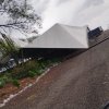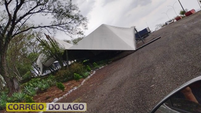 Na manhã desta terça-feira (30), um temporal com fortes rajadas de vento atingiu a região do Monumento de Nossa Senhora Aparecida, em Itaipulândia, e destruiu parte da estrutura montada para as celebrações da Semana da Padroeira.