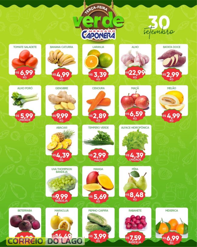O Mercado Caponera realiza nesta terça-feira (30) mais uma edição da Terça Verde, com promoções imperdíveis na seção de hortifruti. A oportunidade para quem busca produtos frescos, saudáveis e de qualidade.