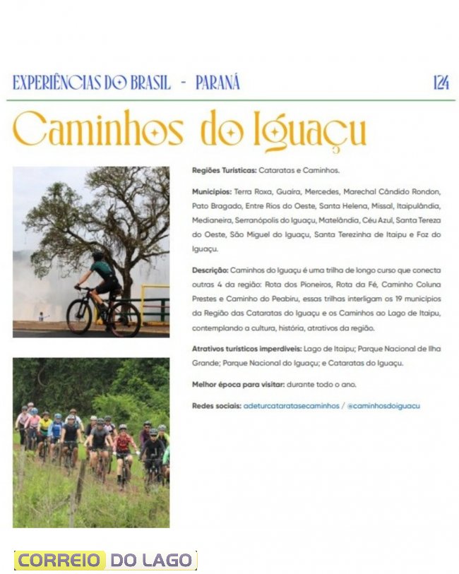 O território Cataratas do Iguaçu e Caminhos ao Lago de Itaipu é destaque no Paraná entre as experiências turísticas listadas no Catálogo de Experiências Turísticas "Conheça o Brasil - Edição Especial COP30”, que estará disponível no evento que ocorre de 10 a 21 de novembro em Belém (PA). Dos três destaques listados no Estado, dois são da região, Experiência no Território Apepú e Caminhos do Iguaçu.