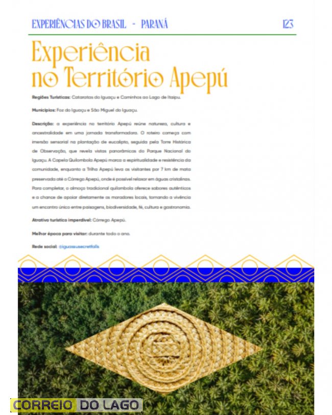 Composto por texto e imagens, o catálogo destaca ‘Experiência no Território Apepú’, nos municípios de Foz do Iguaçu e São Miguel do Iguaçu, com destaque para natureza, cultura e ancestralidade.