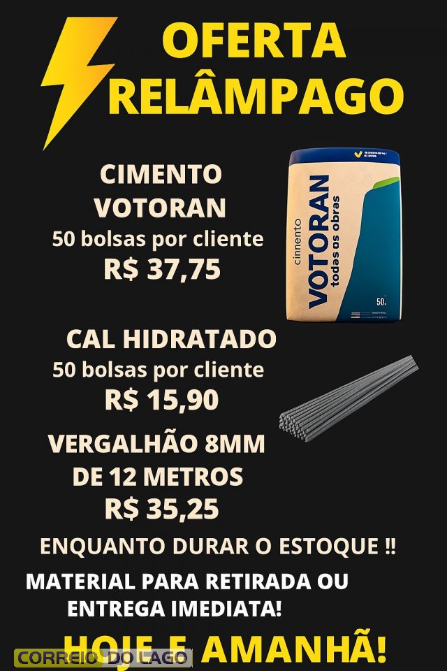 O Ponto Forte – Rede Bem Viver, em Santa Helena, preparou uma oferta relâmpago que você não pode perder nesta terça-feira (28). O cimento Votoran está disponível por R$ 37,75 a bolsa, o cal hidratado por R$ 15,90 e o vergalhão de 8mm, com 12 metros, por R$ 35,25. Cada cliente pode adquirir até 50 bolsas de cada produto, garantindo economia e qualidade para sua obra.