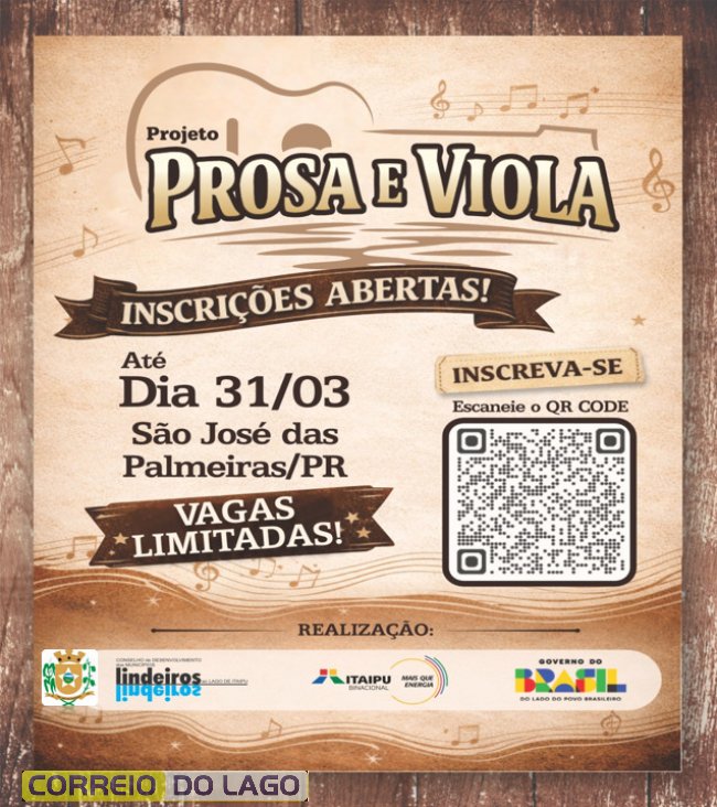 Estão abertas as inscrições para o Projeto Prosa e Viola — uma iniciativa do Conselho de Desenvolvimento dos Municípios Lindeiros ao Lago de Itaipu em parceria com a Itaipu Binacional.
