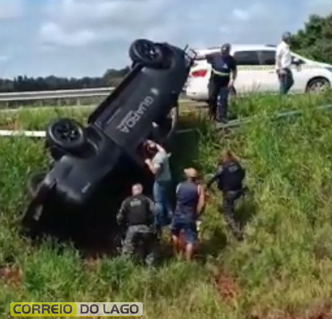 Viatura da Guarda Municipal capotou na tarde desta terça-feira (24), na Perimetral Leste, em Foz do Iguaçu, no Oeste do Paraná.