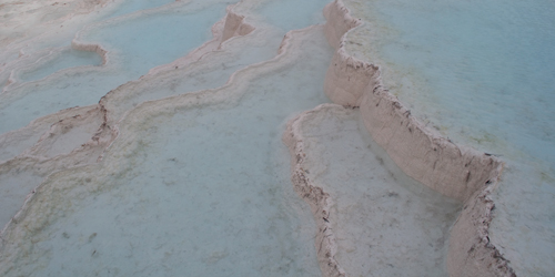 Estou agora em Pamukkale, ou seja, Castelo de Algodão o qual é outro desses lugares do mundo impossíveis de descrever. Cheguei até aqui meio que por acaso, por indicação do meu amigo turco de Izmir. Águas termais, ricas em minerais, brotam em abundância na montanha ali ao lado do hotel. Através de uma complexa reação química, que só sendo químico mesmo para poder explicá-la, forma-se uma belíssima rede de terraços que acumulam água em uma sequência de piscinas que refletem a cor do céu azulado. A cor do material que se forma é branca, igual à neve, mas não é. O lugar é um dos mais interessantes e bonitos que eu já conheci e uma visita à Turquia, na minha opinião, merece pelo menos 1 dia neste local. Mas venham no verão!