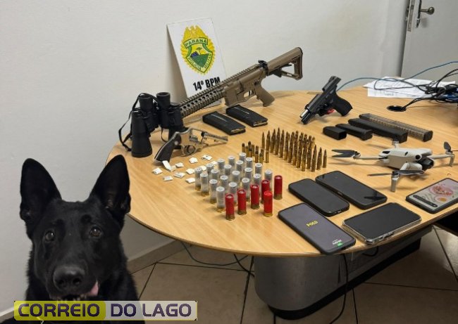 Na madrugada de sábado (25), por volta das 23h, uma operação conduzida por equipes da Polícia Militar do Paraná, por meio do Canil do Batalhão de Polícia Rodoviária (BPRv) e do 14º BPM, resultou na prisão de três homens e na apreensão de armas, munições, drogas e diversos objetos em Foz do Iguaçu.