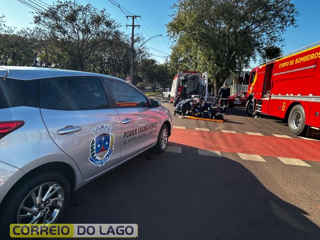 Na manhã desta terça-feira (08), um acidente de trânsito foi registrado no cruzamento entre a Avenida Brasil e a Avenida Curitiba, em Santa Helena. A colisão envolveu um veículo Toyota Yaris, pertencente à Câmara de Vereadores do município e uma motocicleta Honda Biz 125 de cor prata.