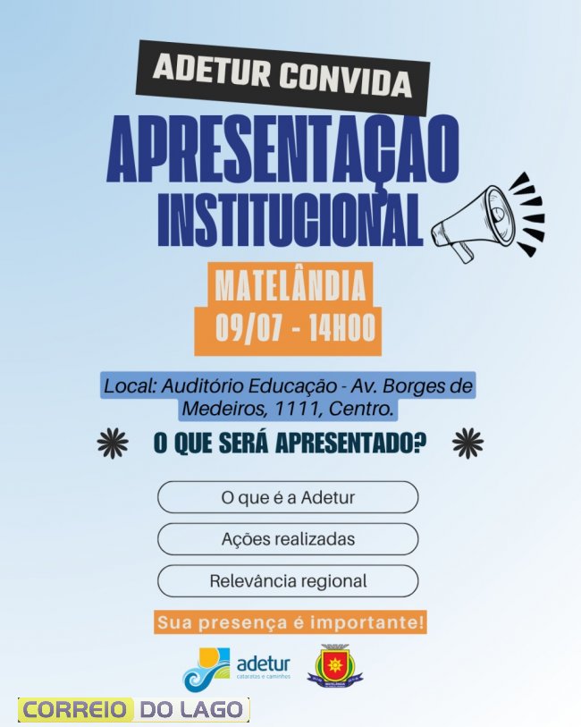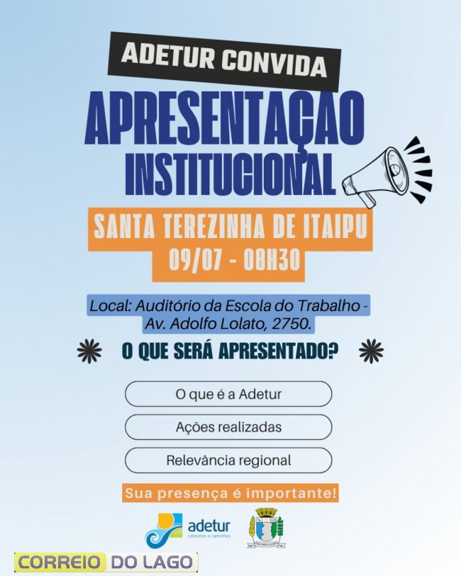 A Adetur Cataratas e Caminhos iniciará, a partir do dia 9 de julho, uma série de apresentações institucionais nos 19 municípios de sua área de atuação, com o objetivo de sensibilizar empresários do setor turístico e a comunidade em geral sobre a importância da associação para o desenvolvimento regional. As ações também visam captar novos associados.