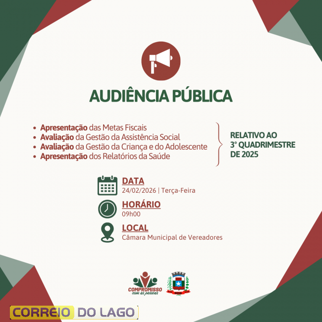 O convite se estende a toda a população, entidades civis e de classe, onde serão apresentadas as avaliações das Metas Fiscais, da Gestão da Criança e Adolescente e da gestão da Assistência Social referentes ao 3º quadrimestre de 2025, e em consequência do ano passado.